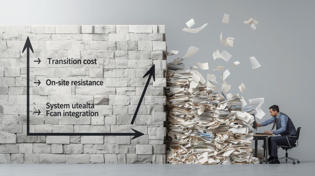もちろん、移行には課題も伴います。第一に初期移行の大変さです。数千枚規模の図面や成績書をスキャンし、データ整理する作業は相応のリソースを要します。次に現場の抵抗感。紙文化に慣れたベテラン社員は「紙の方が早い」「デジタルは苦手」と拒否反応を示すことが多いです。さらにシステム統合の難しさも大きな壁です。ERPや既存の生産管理システムと接続できなければ、別システムが乱立して余計に複雑化するリスクもあります。つまり、導入には「段階的な移行計画」「教育・研修」「システム統合戦略」の三位一体でのアプローチが不可欠です。